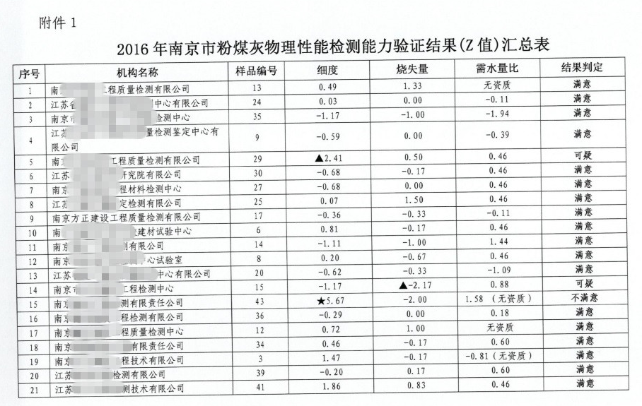 2016年南京市粉煤灰物理性能檢測(cè)能力驗(yàn)證情況